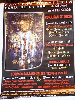 Lors d’un week-end très taurin, la semaine dernière, les organisateurs palavasiens ont dévoilé le programme de la Feria de la Mer 2008 (25 au 30 avril et 1er au 4 mai), toujours avec le souci de présenter toutes les tauromachies, en plus des Espagnols et Camarguais, les Landais débarqueront en 2008 à Palavas pour une journée du Sud-Est, le 3 mai. Si les affiches des corridas présentées par Robert Margé sollicitent les meilleurs de la discipline, les courses camarguaises – avec Sabri Allouani aux commandes – ne sont pas en reste. Sont annoncés: le 27 avril, Voltigeur (Vitou), Vidourlen (Mermoux), Petit Lou (Chaballier), Co Blanco et Condor (Lautier), Caïman (Margé), Faucon (Nicollin) et le 4 mai, Figaro (Margé), Sauron (Mailhan), Lebrau (Plo), Chanéac (Chaballier), Rodin (Les Baumelles), Mathis (Lautier) et Eva (Ricard). En alternance, Allouani, Villard, Outarka, Moutet, Marquier, Clarion, Jourdan, Martinez, Ouffe, Martin-cocher, Oleskevich et Jockin seront sollicités.