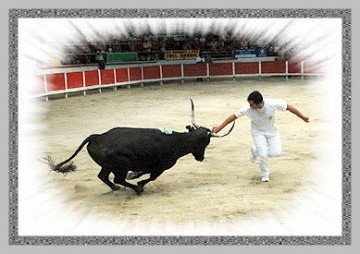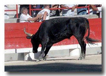 De cette 3ème journèe, peu de choses à retenir si ce n'est l'excellente prestation de SEVERO de Ribaud, sorti quatrième qui dés la deuxième minute met tout le monde au diapason en accrochant Moutet à la barrière (deux bonnes pointes dans la fesse et la cuisse). Cocardièrement le taureau est parfait, placè, surveillant tout et venant se cabrer devant les planches en envoyant la corne pour tenter de ramener ses adversaires en piste, il est le patron incontestè. Avec lui n'en déplaise à certains, les problèmes en piste n'existe pas !!! CAMARINA de Chauvet sixième du haut de son piédestal provençal (et de ses 13 ans) a rempli son contrat avec de nombreuses actions aux planches qui ont ravi un public tout acquis à sa cause. Il termine cette course sur la note attendue avec une multitude de Carmen et la grande ovation. Respect pour le Biou d'Or 2005. NENUPHAR de La Galère second, seulement huit minutes, mais de belle facture. AFOUGA de Nicollin premier, cinq minutes ! GALAAD des Baumelles troisième, trop vert pour ce genre de course. VARENNE de Lautier cinquième, est plus à l'aise dans des pistes plus réduites.