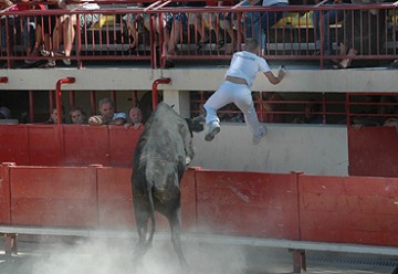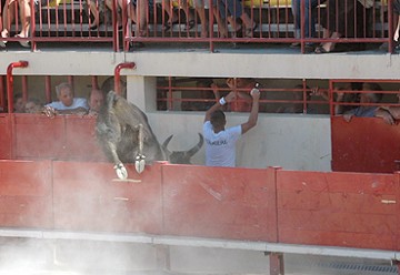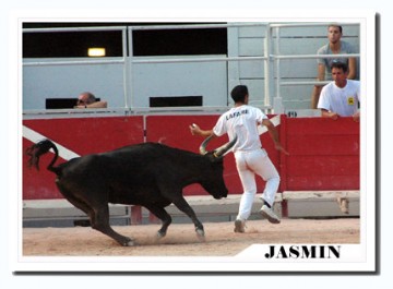 Tel un Miura, ZANGRA (Lagarde) est lourd et manque de rapidité mais tel un bulldozer il démonte violemment les panneaux de planches. Ah s’il pouvait canaliser son énergie et sa méchanceté. 1 Carmen et une ficelle au toril.