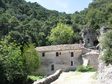 Arrivés à un col d'où part l'ancien chemin vers le chateau vous jouissez d'un superbe panorama sur le village et les monts avoisinnants dont le célèbre Pic Saint Baudille. Poursuivez par le GR qui grimpe régulièrement vers le nord en ignorant le chemin qui arrive de la droite (circuit du retour). Vous passez devant le calvaire des Trois Croix pour atteindre enfin, en partie caché par les magnifiques pins de Salzman qui ont colonisé l'endroit, l'ermitage Notre dame de Belle Grâce (dénommé aussi dans certains documents « du lieu plaisant) lieu idéal de repos et de pique-nique. Un robinet d'eau potable est implanté derrière la Chapelle au pied du rocher qui la domine.
