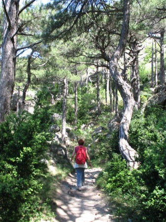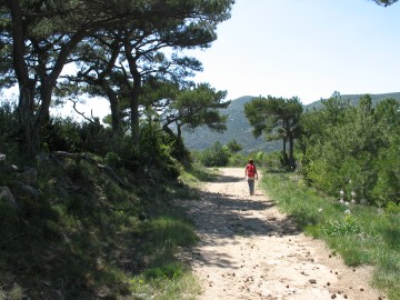 On peut soit revenir par le même chemin soit poursuivre par le GR qui continue vers le nord-nord au milieu des buissons de romarin et de bruyère et des bosquets de pins de Salzman. Celui ci grimpe jusqu'au col de Ginestet (534 m d'altitude) qui offre vers la droite de belles vues sur le massif de la Séranne. On descend alors jusqu'à une confortable piste forestière que l'on prend vers la gauche et qui sinue au dessus d'une large combe.