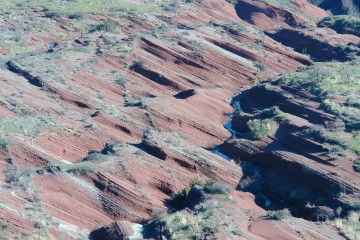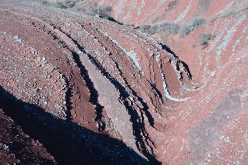 On retrouve dans sa construction toute l'histoire géologique de la région les blocs de basalte noirs se mêlant aux blocs de grès ou de pélite.