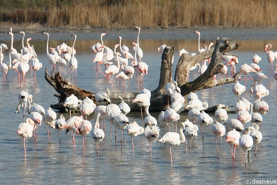 Un troupeau de flamants rose jacassent à distance respectable des bipèdes qui passent,