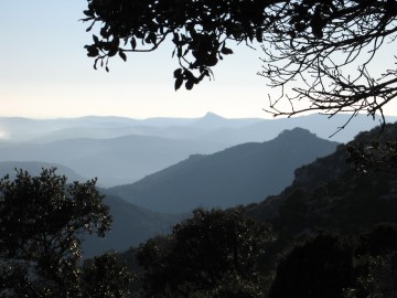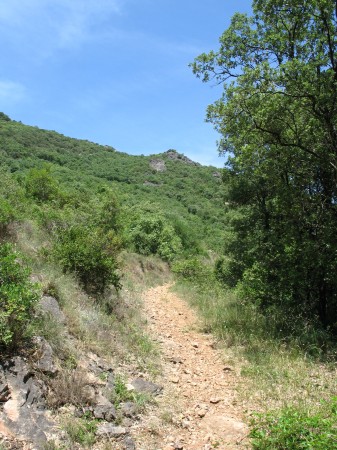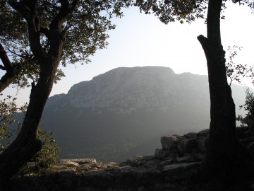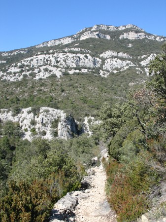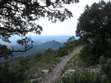 Un poteau indicateur vous met sur le chemin, fort bien fléché en jaune (il suit également un GR fléché en rouge-blanc jusqu'au sommet). Il démarre derrière le transformateur et passe au dessus de la bergerie pour grimper en lacets dans la garrigue (ne manquez pas le chemin qui part à droite environ 300m après le départ). Le relais de télévision qui coiffe le pic vous sert de repère et d'objectif. Vous cheminez un instant dans un rafraichissant tunnel de verdure formé par les chênes verts.