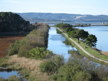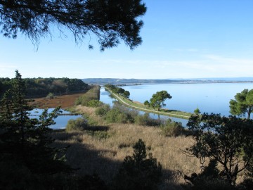 Vous passez dans l'île à pied ou en vélo.... en utilisant la passerelle de l'écluse. Un paradis de pinèdes et de garrigues émaillées d'oliviers et d'amandiers s'offre alors à vous. En faisant le tour de l'ïle (le plan des chemins est indiqué mais vous pouvez utiliser la carte IGN TOP 25 2546 OT) ne manquez pas d'aller au Roc Saint Antoine qui offre un magnifique panorama sur les étangs jusqu 'aux Pyrénées, puis de longer les falaises surplombant le pittoresque domaine de Sainte Lucie niché au milieu des palmiers( un chemin y conduit) Quelques bâtiments subsistent témoins d'activités aujourd'hui révolues (cantine des « salins » , bergerie..) mais hélas il ne reste rien des galères grecques et romaines et des bateaux phéniciens qui accostaient dans l'anse de la Cauquenne (sur la gauche de l'île) qui était à l'époque un avant port de Narbonne !!
