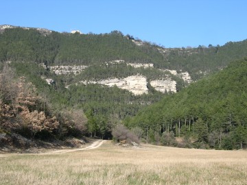 Elle débouche sur une autres piste que vous empruntez à gauche (le retour se fait par la droite). Poursuivez jusqu'à atteindre un chemin qui part sur la gauche signalé par un panneau « chemin dangereux A pics » que néanmoins vous empruntez (de fait si vous n'abusez pas du rosé au pique nique il est sans danger !). Ce chemin qui sinue sur le flanc du cirque offre des vues splendides sur la vallée et les falaises environnantes. Peu de temps après une plateforme s'offre à vous qui est le seul endroit du parcours se prêtant au pique nique.