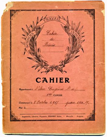 J’ai trouvé il y a longtemps, dans le grenier d’une maison achetée par un frère, le cahier d’une écolière, cahier de poésies écrites à la plume, bien sûr, avec, fort bien calligraphiés, les pleins et les déliés. Comme il est écrit sur sa page de garde, le cahier avait été « commencé » le 8 octobre 1917...