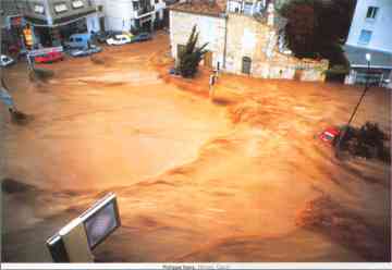 L’homme qui s’était réfugié là était en grand danger d’être emporté par la violence des flots dont le niveau montait à vue d’œil. Nous avons appelé les pompiers qui étaient « débordés » si l’on peut dire… L’eau atteignait le rebord des vitrines de la banque et l’homme faisait de grands signes désespérés. Nous avons vu enfin quelqu’un sur le toit de la banque, progressant prudemment sur les tuiles, venant malgré les risques évidents se mettre au niveau de l’homme et lui lancer une corde dont il se saisit alors que l’eau lui arrivait au haut des cuisses.