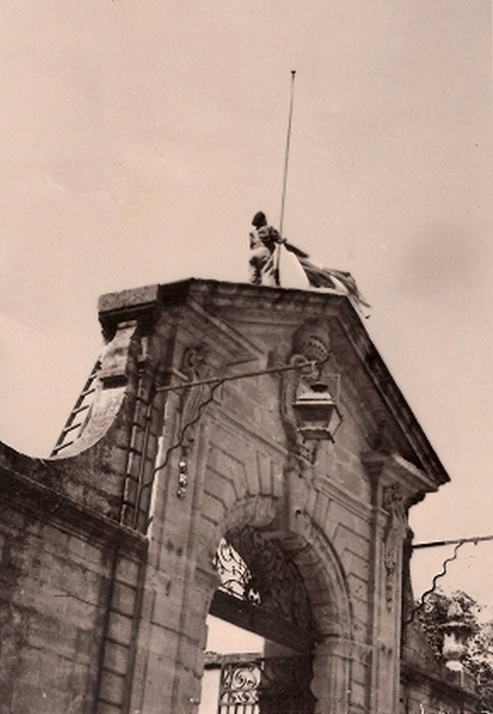 Mon Grand Père André GUIRAUD"Le Pigneton" sur l'entrée de la Mairie de Lodève en train de hisser le drapeau le jour de la libération de lodève, à la fin de la deuxième guerre mondiale