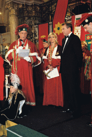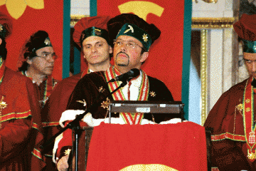 Epaulée par mon "parrain" je monte sur la scène devant la Noble Assemblée des Hauts Dignitaires (vêtue de la cape de cérémonie) pour prêter serment à