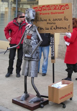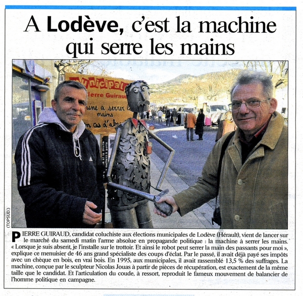| C'est la dernière trouvaille de Pierre GUIRAUD, le candidat " coluchiste" à la mairie de Lodève.Cette machine à serrer les mains est une statue d'1m68 en métal récupéré et dont le bras droit est monté sur ressort . Une manière pour le candidat de se moquer des hommes politiques que l'on voit sur le terrain uniquement lors des élections . | |