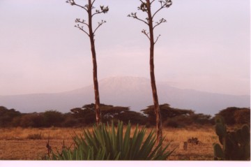 A gauche le MAWENZI (5149 m) et le KILIMANJARO (5898 m) se situent en Tanzanie.