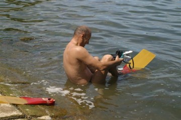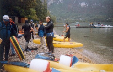 Je mets donc mes « Zoomers » de la traversée de Sète au placard et j’ai une semaine pour faire des essais avec mon nouveau matériel, car nous nous sommes inscrits à la traversée de 20km dans le lac du Bourget. Pour ce qui est des palmes, pas trop de difficultés, mais pour ce qui est du tuba ce n’est pas évident et je ressorts de l’eau avec les sinus remplis d’eau. Je pars vers le Bourget après avoir pris soin de m’acheter un pince nez et en me disant que normalement tout doit bien se passer.Là, nous découvrons un nouveau monde, où les nageurs ont une palme unique en forme de queue de poisson (c’est ce que l’on appelle une mono-palme) et d’autres avec 2 palmes comme nous mais avec un gros flotteur pour se reposer dessus (on dit qu’ils nagent avec appui). Habituellement, lors de nos épreuves en eau libre, la combinaison est interdite, mais là elle est autorisée. Heureusement que je le savais et je suis monté avec mon « shorty ». Pour ce 20km, un kayak accompagne le nageur pour le ravitailler.